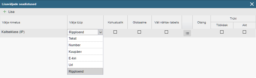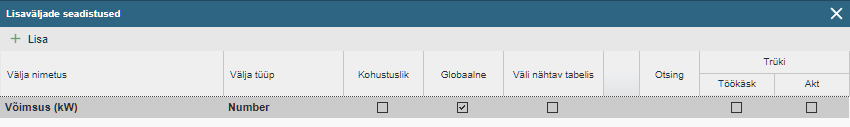 Märkus: Antud seadistus tekkis versioonist 1.6.34. Varasemates versioonides kuvati tabelites ainult globaalseid lisavälju. See loogika on nüüdseks eemaldatud ning asendatud eraldi valikuga.