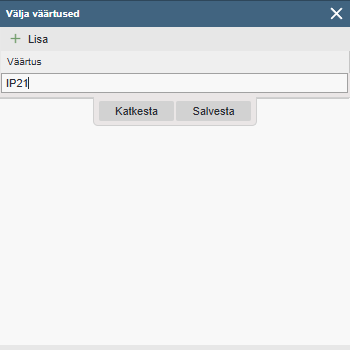 Valikute lisamiseks kliki nupule „Lisa“ ning avanenud väljale kirjuta soovitud valik. Valiku muutmiseks tee topelt klikk soovitud real. Peale muudatuste tegemist vajuta nupule ’Salvesta’. Valiku kustutamiseks tee soovitud real klikk hiire parema klahviga ja avanenud kontekstimenüüst vali ’Kustuta’.
