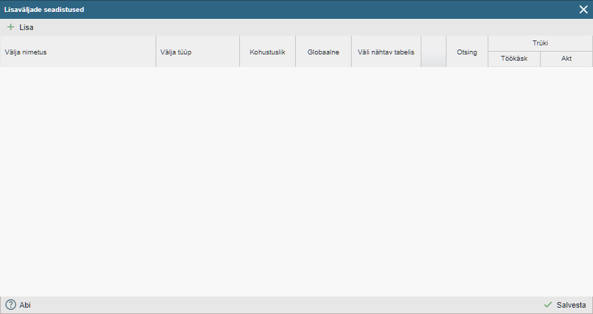 Lisaväljade haldamise aknas näed kõiki juba loodud lisavälju (kui neid on loodud).