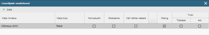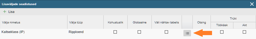 Väli nähtav tabelis: Võimaldab määrata, kas antud lisaväli tekkib ka töökäskudega seotud tabelites tulpade nimekirja mida on võimalik seal kuvada.