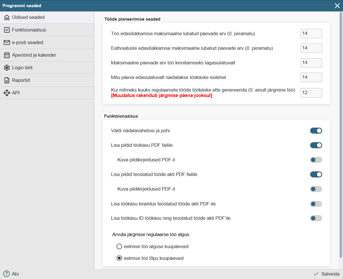Kui pikaks perioodiks regulaarsete hoolduste töökäske ette genereerida (kuudes): Selle parameetri abil saab määrata, kui pikaks perioodiks programm perioodiliste hoolduste töökäsud valmis genereerib. Kui sisestusarv on null, luuakse ainult lähima saabuva hoolduse töökäsk. Kui sisestusarv on näiteks 12, siis luuakse kõik töökäsud, mis jäävad sellele perioodile või vähemalt üks lähima saabuva hoolduse töökäsk (juhul, kui välp on pikem, kui valitud sisestusarv).