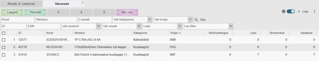 - Miinimumkogus – Soovituslik miinimumkogus varuosa laos hoidmiseks. Kui „Saadaval“ väärtus on väiksem, kui seatud miinimumkogus, värvitakse vastava varuosa rea taust roosakaks.