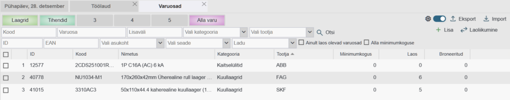 - Miinimumkogus – Soovituslik miinimum kogus varuosa laos hoidmiseks. Kui „Saadaval“ väärtus on väiksem kui seatud miinimumkogus, värvitakse vastava varuosa rea taust roosakaks.