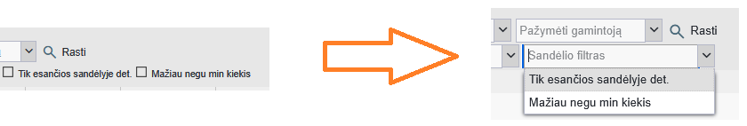 • [#1031] Atsarginių detalių lentelėje, varnelėmis žymimi ankstesni filtrai „Tik esančios sandėlyje det.” ir „Mažiau negu min kiekis” buvo paversti į išskleidžiamojo tipo filtrus.