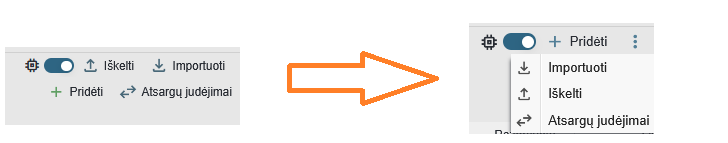 Atsarginių detalių lentelėje, anksčiau dešinėje pusėje išdėstyti mygtukai „Atsargų perkėlimai”, „Importuoti”, „Iškelti”, nuo šiol perkelti į toje pusėje esantį papildomo meniu mygtuką.
