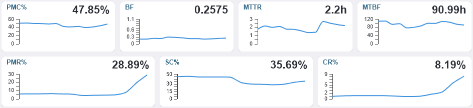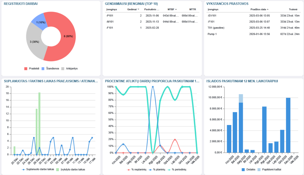 Rodiklių skydelyje atvaizduojamos dažniausiai naudojami įrenginių priežiūros efektyvumo rodikliai (KPI – Key Performance Indicators), kartu su keliais statistiniais moduliais.