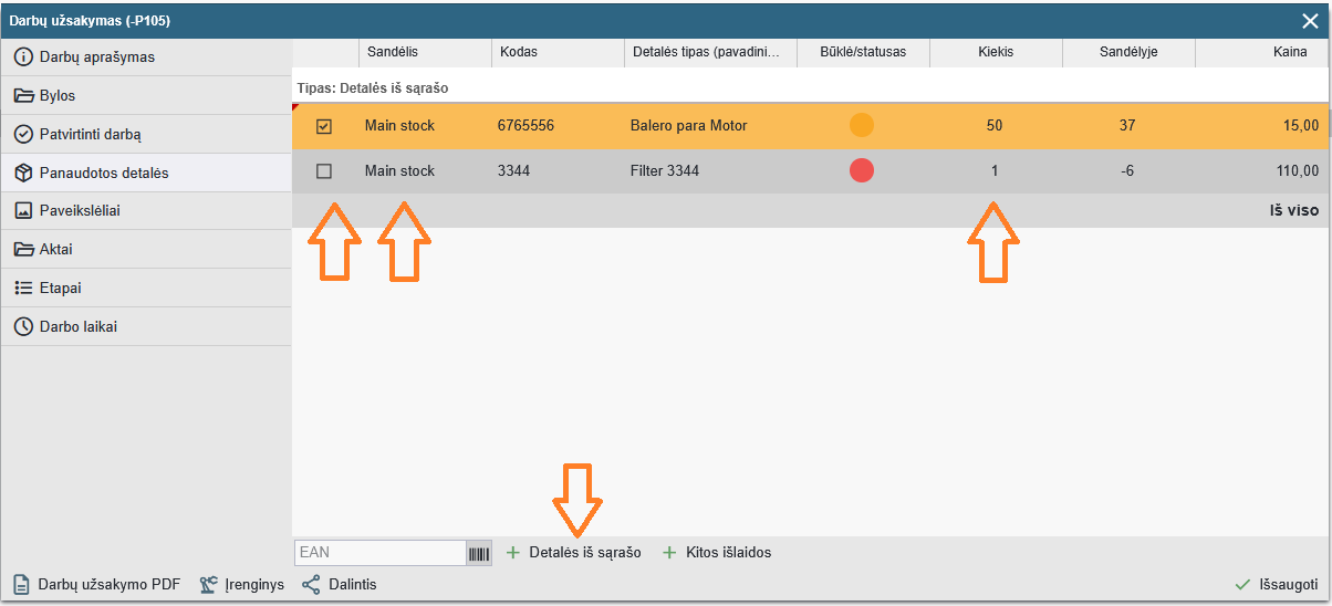 Sąraše varnelėmis pažymėkite darbo atlikimui reikiamas atsargines detalės. Taip pat nurodykite kiekius ir sandėlį, iš kurio bus imamos detalės.