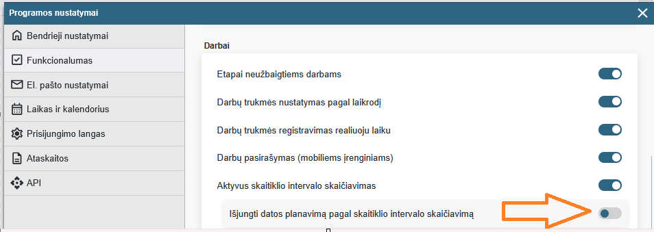 Taip, tai yra įmanoma. Norint tai atlikti, atverkite viršutinio meniu Nustatymai > Nustatymai > Funkcionalumas … eikite į „Darbai” skiltį ir pažymėkite „Išjungti datos planavimą pagal skaitiklio intervalo skaičiavimą”.