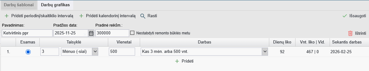 Norint sukurti skaitiklio pagrindu veikiantį darbų intervalą (grafiką), turite naudoti Periodinį/Skaitiklio intervalą. Norint tai atlikti, atverkite norimą įrenginio kortelę, eikite „Darbo intervalai” skiltį, tuomet „Darbų grafikas” poskiltį (prieš tai turėjo būti sukurtas atitinkamas darbų šablonas).