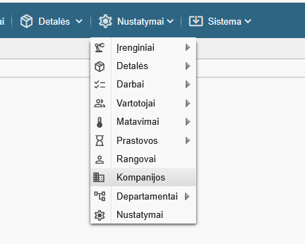 Norint atverti kompanijos pakeitimo langą, eikite į viršutinio meniu „Nustatymai > Kompanijos” parinktį.