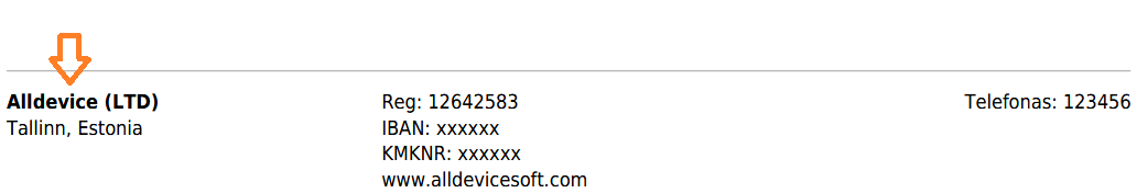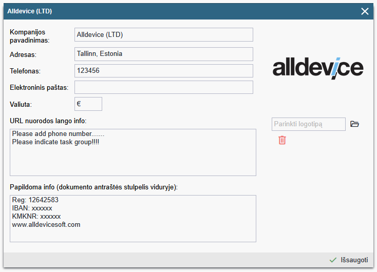 Kompanijos pavadinimas: tai kliento kompanijos pavadinimas, kuris bus atvaizduojamas: 1) darbų užsakymo kairės pusės apatinėje antraštėje, 2) darbų registravimo lange, pridedamų per URL ir 3) įrenginių medžio pavadinime, esančio kairėje programos lango pusėje.