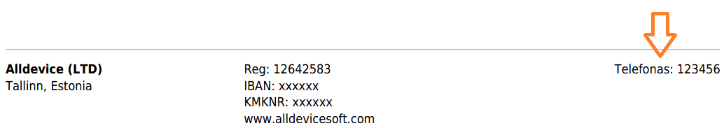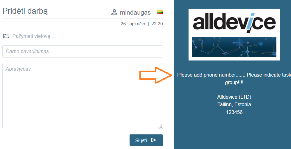 Logo: pasirinktas logotipas, atvaizduojamas darbų PDF formos viršutinės antraštės dešinėje. Pagal nutylėjimą, jei nėra įkeltas joks paveikslėlis, bus rodomas Alldevice logotipas. Jei esamas logotipas bus ištrintas, jis taip pat bus pakeistas į Alldevice logotipą.