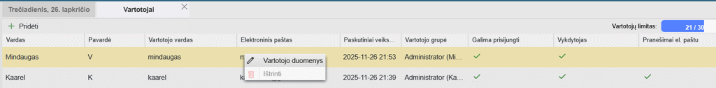 Pastaba! Pridedant naujus vartotojus, nėra apribojimų jų kiekiui. Tačiau norint jiems susteikti prieigą prie programos, leidžiamas kiekis priklauso nuo įsigyto licenzijos paketo.