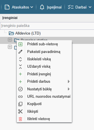 Pastaba! Vietovė negali būti ištrinta, jei joje yra įrenginių – tiek ir tiesiogiai, tiek ir bet kuriuoje jos subvietovėje. Pirmiausia turite pašalinti visus įrenginius iš tos subvietovės (arba ištrinant, arba perkeliant juos kitur). Tik tada galėsite ištrinti norimą vietovę, įskaitant ir jos subvietoves